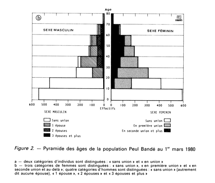 • la forme de la pyramide, très large à la base et se resserrant assez vite et régulièrement lorsqu’on monte dans l’échelle des âges, renforce elle aussi l’effet de l’écart d’âge au premier mariage. Cette forme, que l’on retrouve dans tous les pays en développement, est liée au niveau de fécondité et de mortalité, dont résulte chez les Peul Bandé une croissance de la population : en moyenne 12 pour 1000 par an au cours des 10 dernières années, cette croissance vient d’une natalité très élevée (52 pour 1000) en face d’une mortalité pourtant très élevée également (33 pour 1000) et d’une émigration assez forte (le solde migratoire — émigration moins immigration — est égale à 7 pour 1000). En raison de la croissance de la population, les générations successives sont de plus en plus nombreuses. Du fait de la différence d’âge au mariage, les hommes épousent des femmes appartenant à des générations plus jeunes que la leur, donc plus nombreuses. La polygamie se trouve donc favoriser.